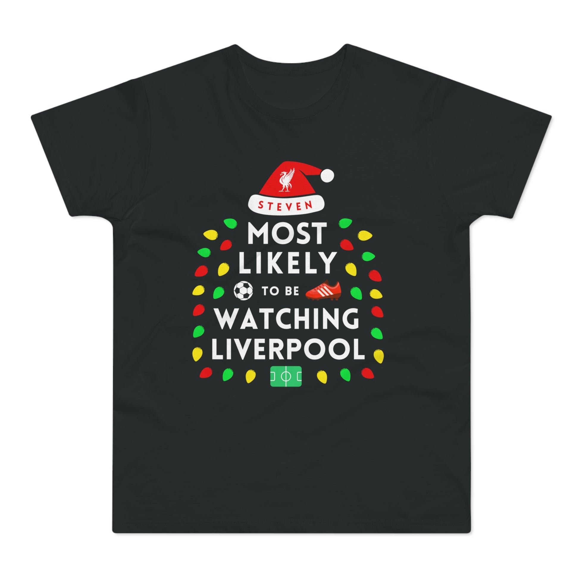Most Likely To Be Watching Liverpool - Mens Personalised Crew Neck Christmas T-Shirt